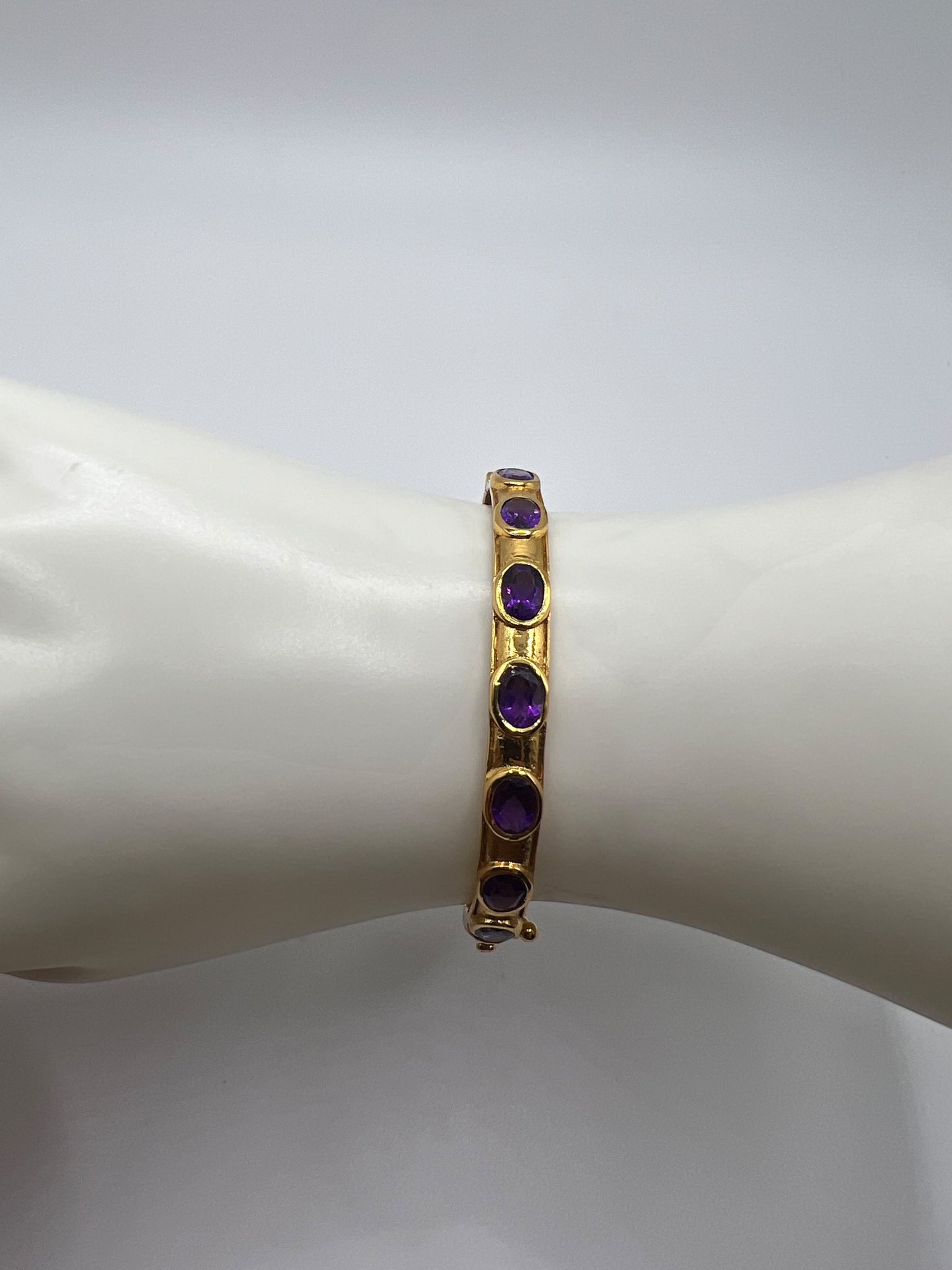 The Amethyst Gold Vermeil Bracelet exudes quiet power and timeless femininity. Deep violet amethyst cabochons, each hand-set in sterling silver and finished with rich gold vermeil, create a luminous contrast that feels both regal and serene. Every stone reflects depth and intuition, a harmony between strength and stillness.