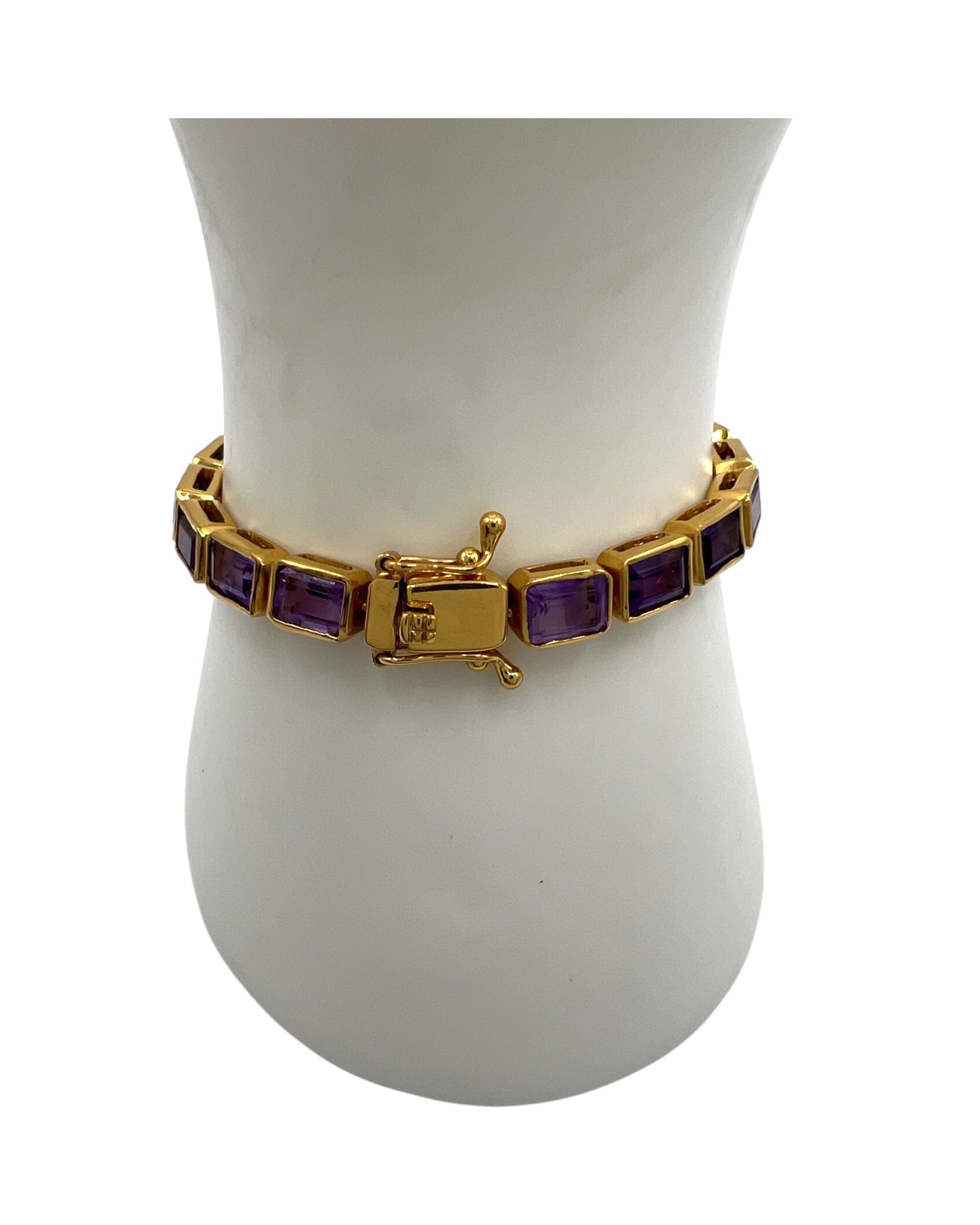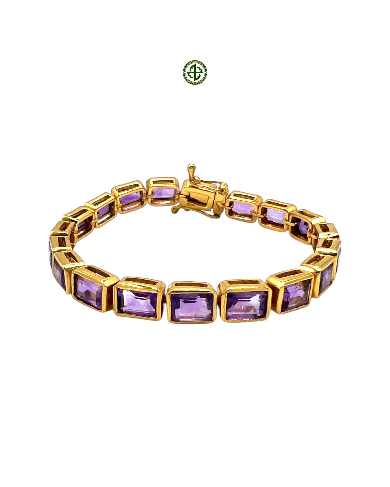The Emerald Cut Amethyst Bracelet captures the soul of quiet luxury. Each emerald-cut amethyst, rich in violet depth, is hand-set in glowing gold vermeil over sterling silver, forming a luminous line of refined symmetry. Known for its aura of calm and spiritual clarity, amethyst brings both serenity and sophistication to its wearer.