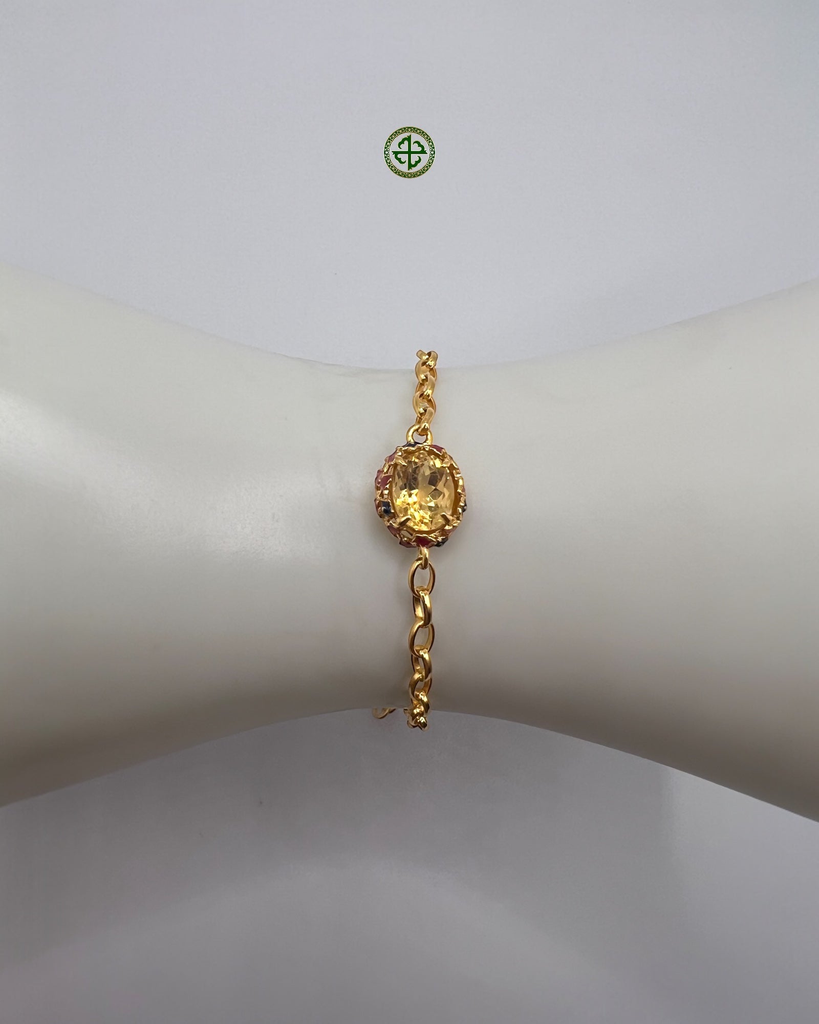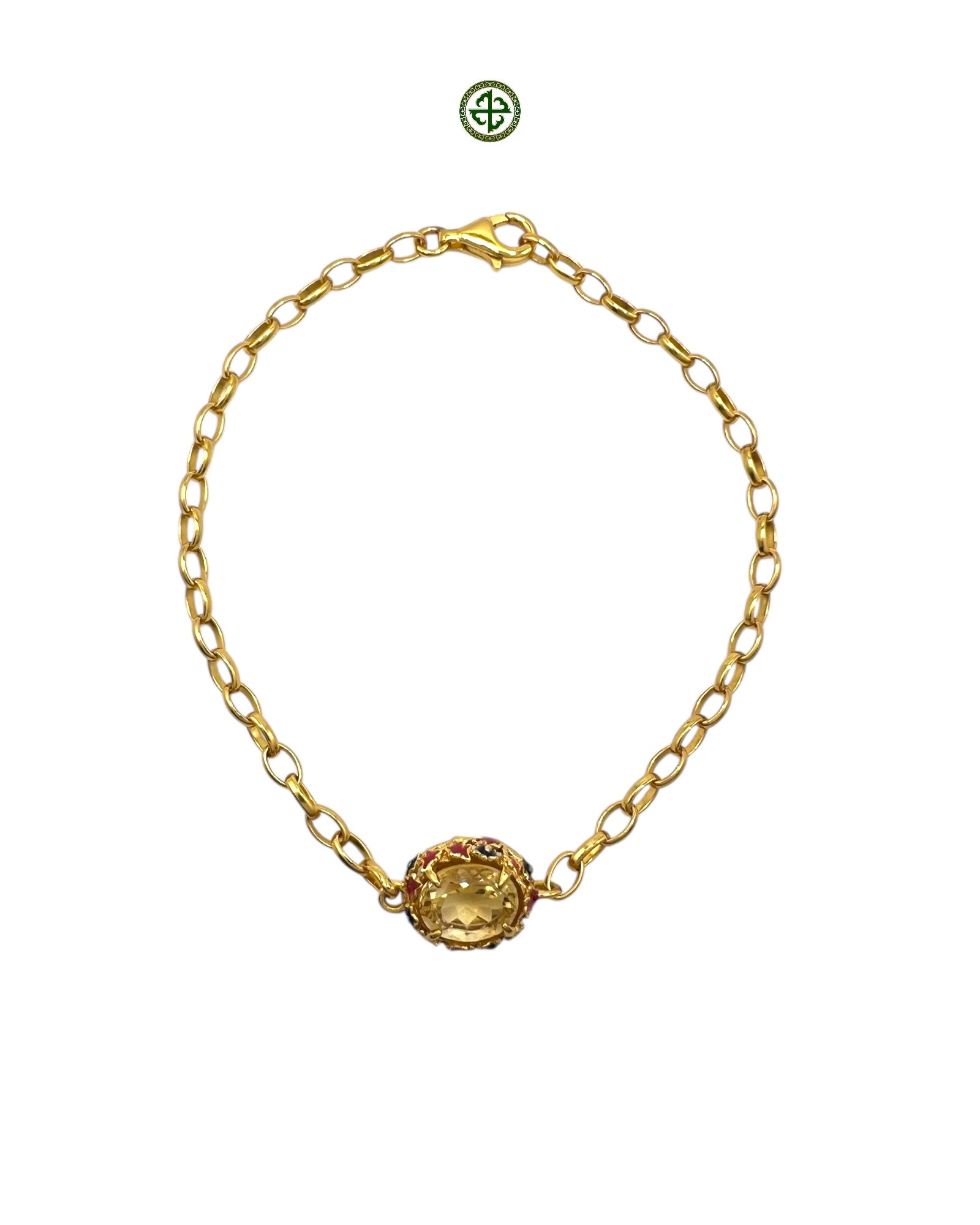 The Orange Citrine Charm Bracelet captures sunlight in wearable form, glowing with the warmth of joy and abundance. Its golden citrine rests in a hand-crafted bezel, adorned with red and blue enamel that dances vividly against the polished gold vermeil. The artistry of the enamel creates contrast and movement, echoing the radiance of the stone itself.