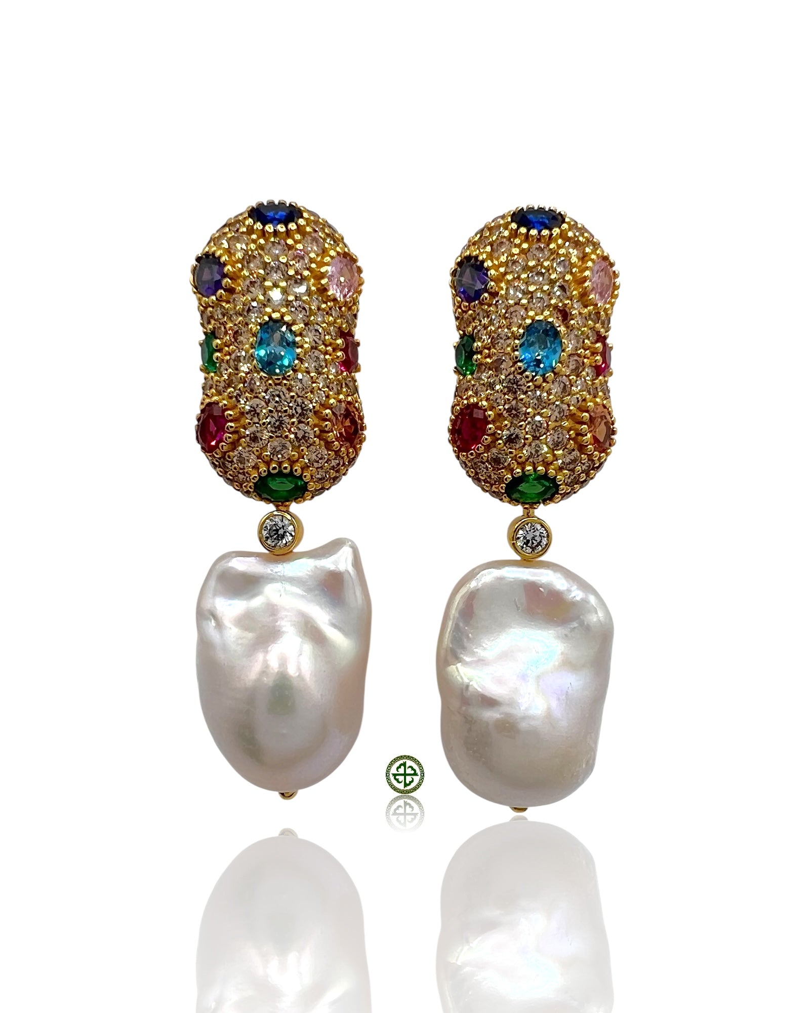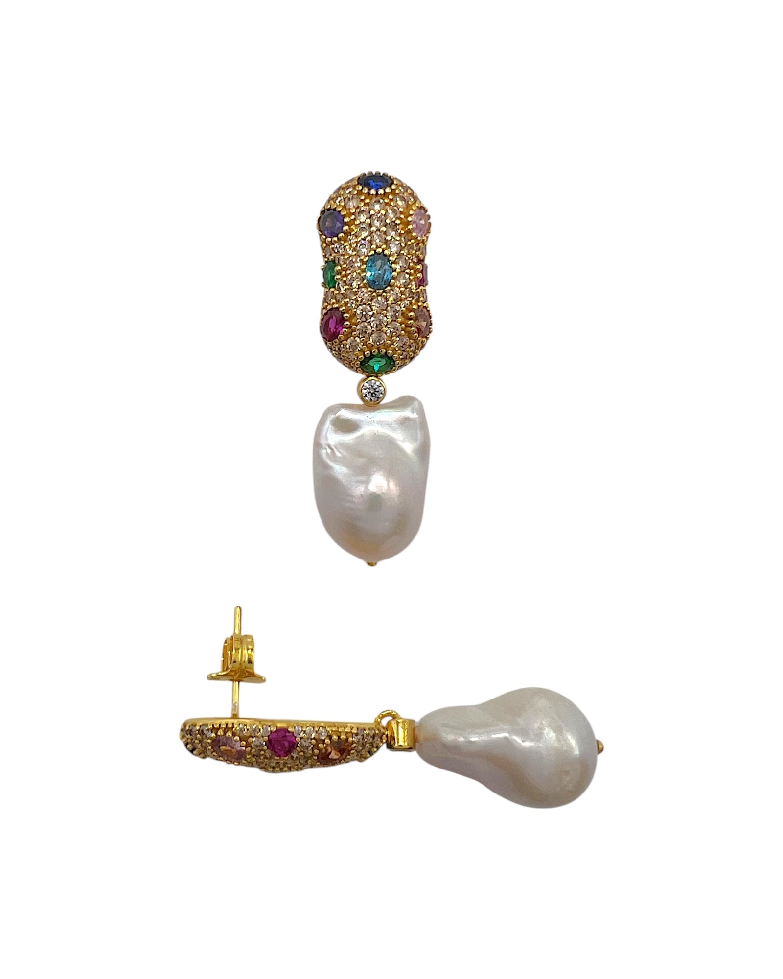 The Champagne Multi-Stone Pavé Baroque Pearl Drop Earrings combine luminous pearl elegance with a kaleidoscope of vibrant gemstones. Champagne pavé stones shimmer with golden warmth, while natural baroque pearls bring individuality and organic beauty. Accented with ruby for passion, emerald for harmony, citrine for optimism, amethyst-like sapphire for wisdom, and blue topaz for clarity, each stone adds symbolic richness to the design. Handcrafted in thick gold vermeil, these earrings radiate sophistication, ideal for weddings, evening events, or elevating daily wear with a touch of luxury.