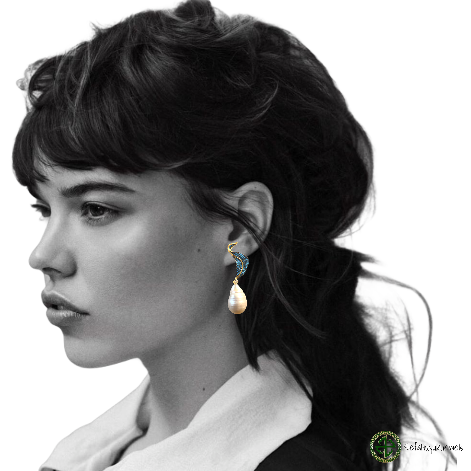 The Cardale Turquoise Zirconia Baroque Pearl Drop Earrings exude regal elegance with their bold blend of colour and form. A fluted slice of turquoise, framed by hand-set black zircons, draws the eye with vibrant intensity before finishing in a luminous baroque pearl. The pairing of turquoise, often said to represent wisdom and protection, with pearls linked to purity and individuality, creates a design rich in symbolism and beauty. Handcrafted in radiant gold vermeil, these earrings embody refined artistry, perfect for evening sophistication or as a meaningful statement gift.
