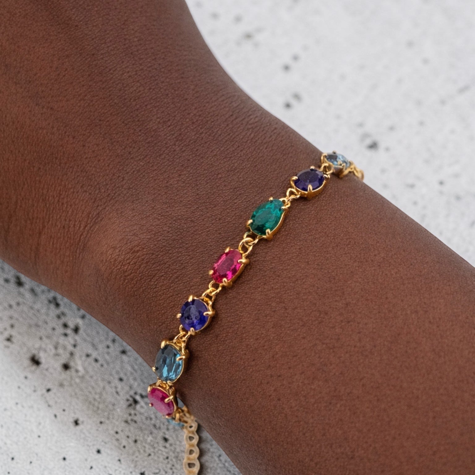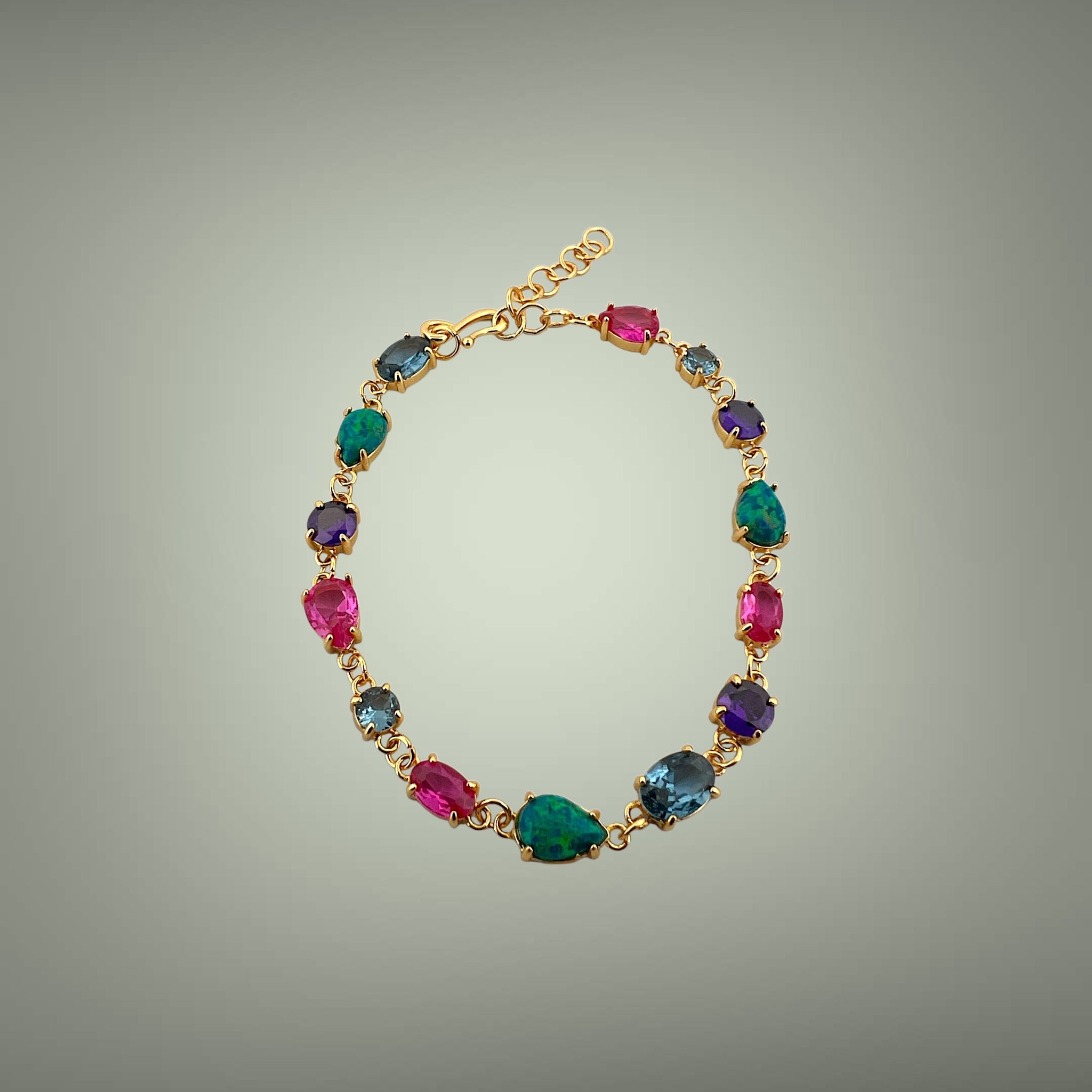 Each gemstone is hand-set in a fine gold vermeil setting, allowing the colors to shine brilliantly. The harmonious mix of deep blues, vibrant pinks, mystical purples, and luminous opals makes this bracelet perfect for both everyday elegance and special occasions.