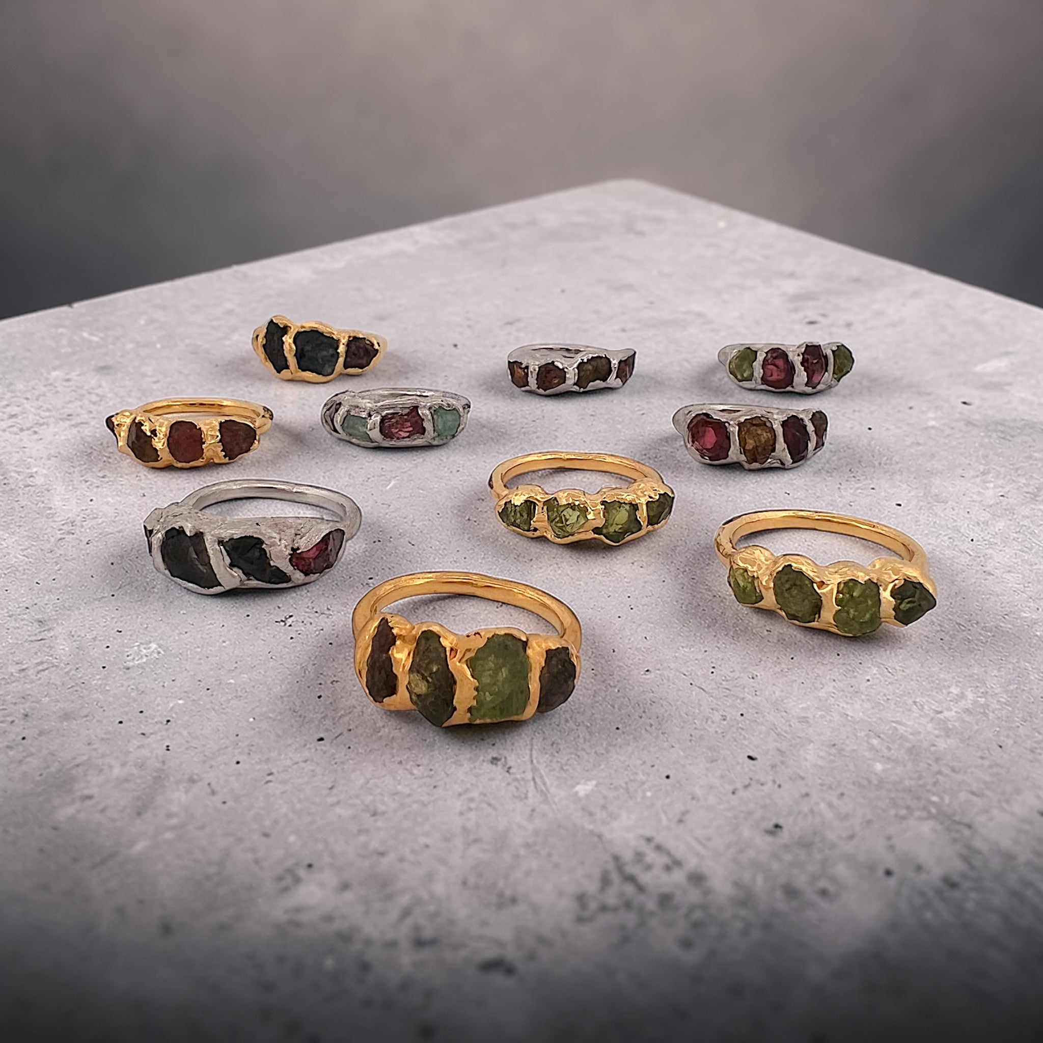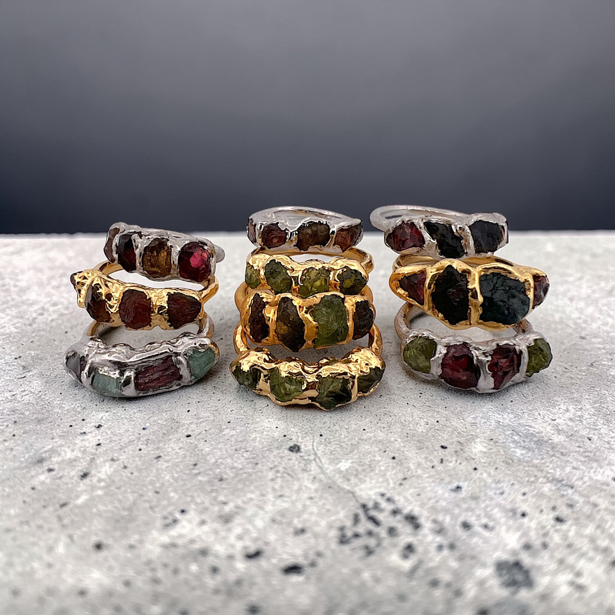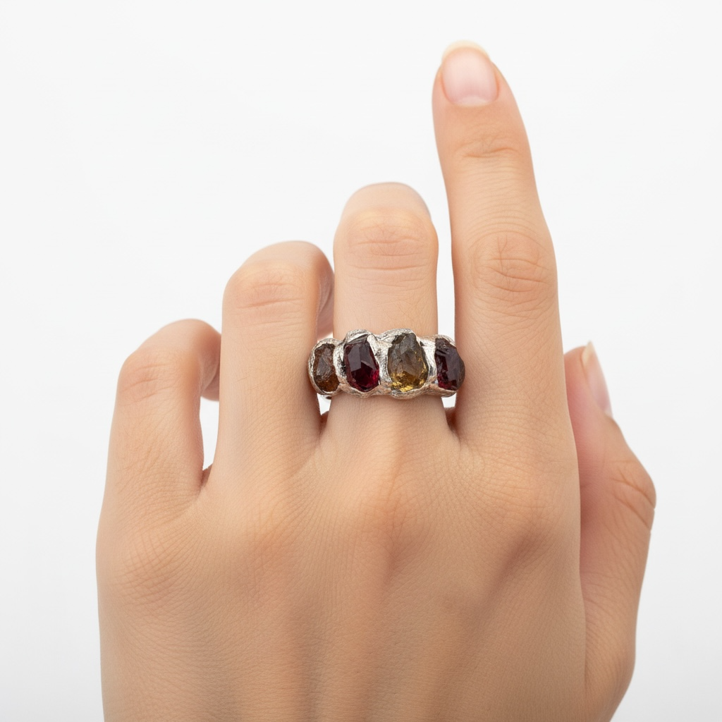 This handcrafted 925 sterling silver garnet and tourmaline ring features four natural gemstones set in a sculptural electroformed band. The rich deep-red garnet pairs effortlessly with warm earthy tourmaline tones, creating a powerful and grounding color combination.
