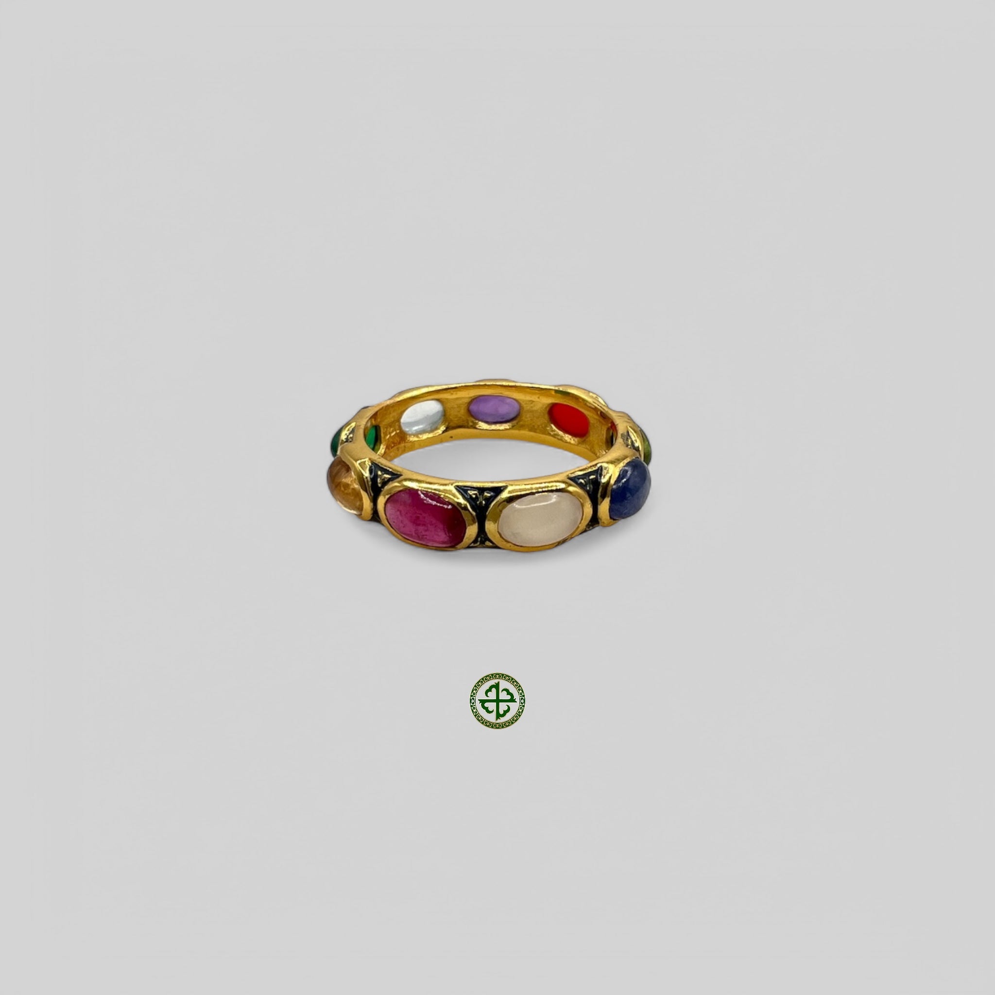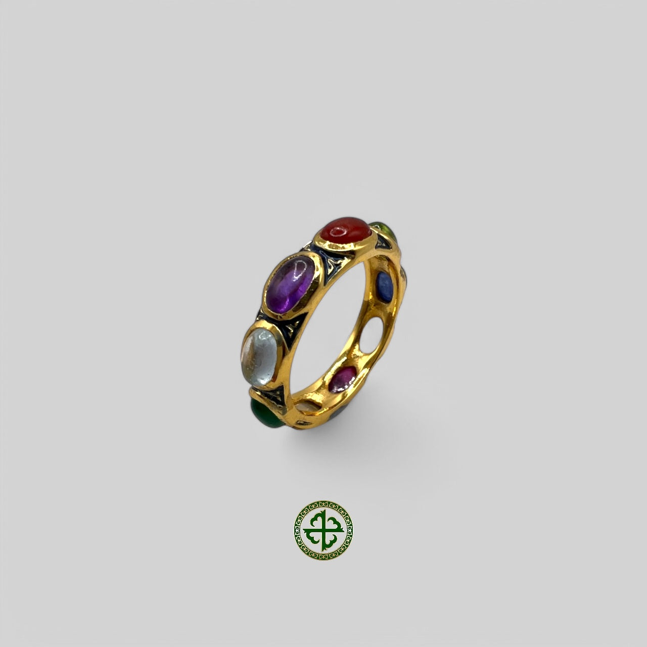 A gold-colored ring featuring a series of multicolored semi-precious gemstones arranged in a nestled pattern with pale blue enamel detailing.