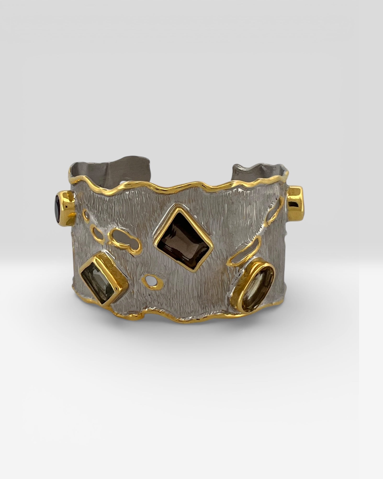 This elegant wide cuff features a harmonious mix of Smoky Quartz, Green Amethyst, Lemon Quartz, Orange Tourmaline, and Amethyst, each carefully bezel-set in rich 18K gold vermeil to enhance the natural beauty and color of every stone.