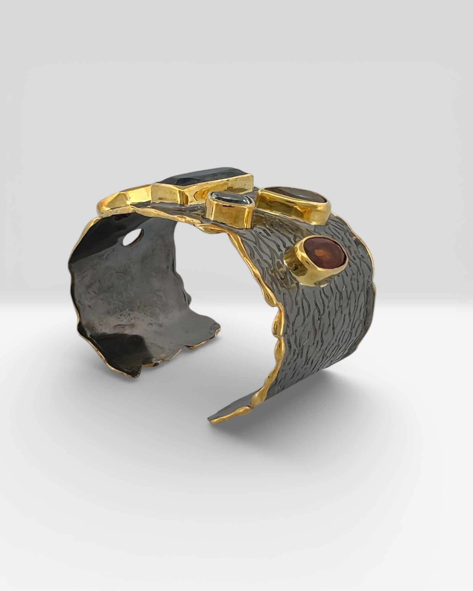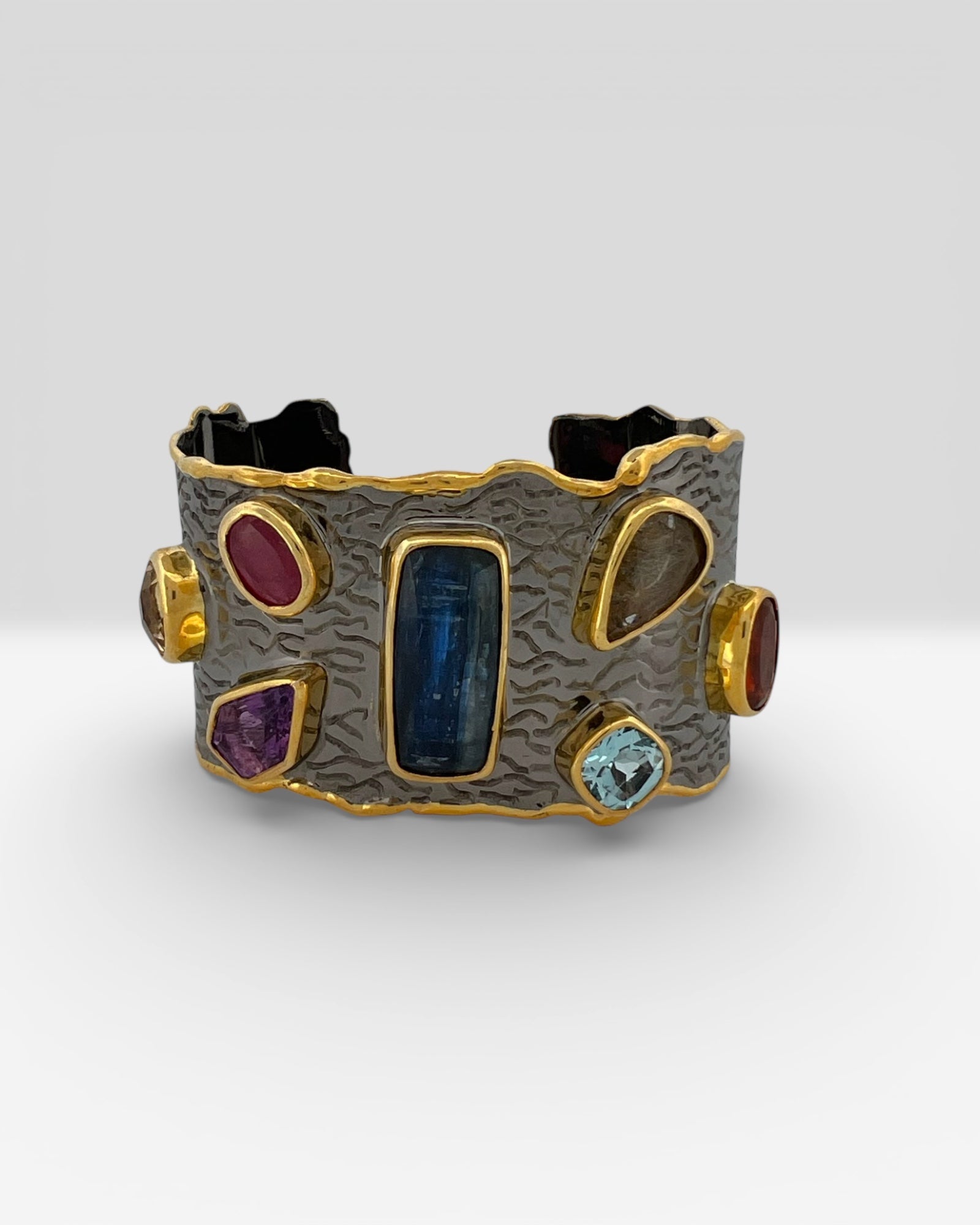 Make a bold statement with this luxurious handcrafted cuff bracelet, designed with a dramatic contrast of black rhodium plated sterling silver and rich 18K gold vermeil accents. The sculptural textured surface is enhanced with a vibrant arrangement of natural gemstones, creating a powerful and artistic jewelry piece.