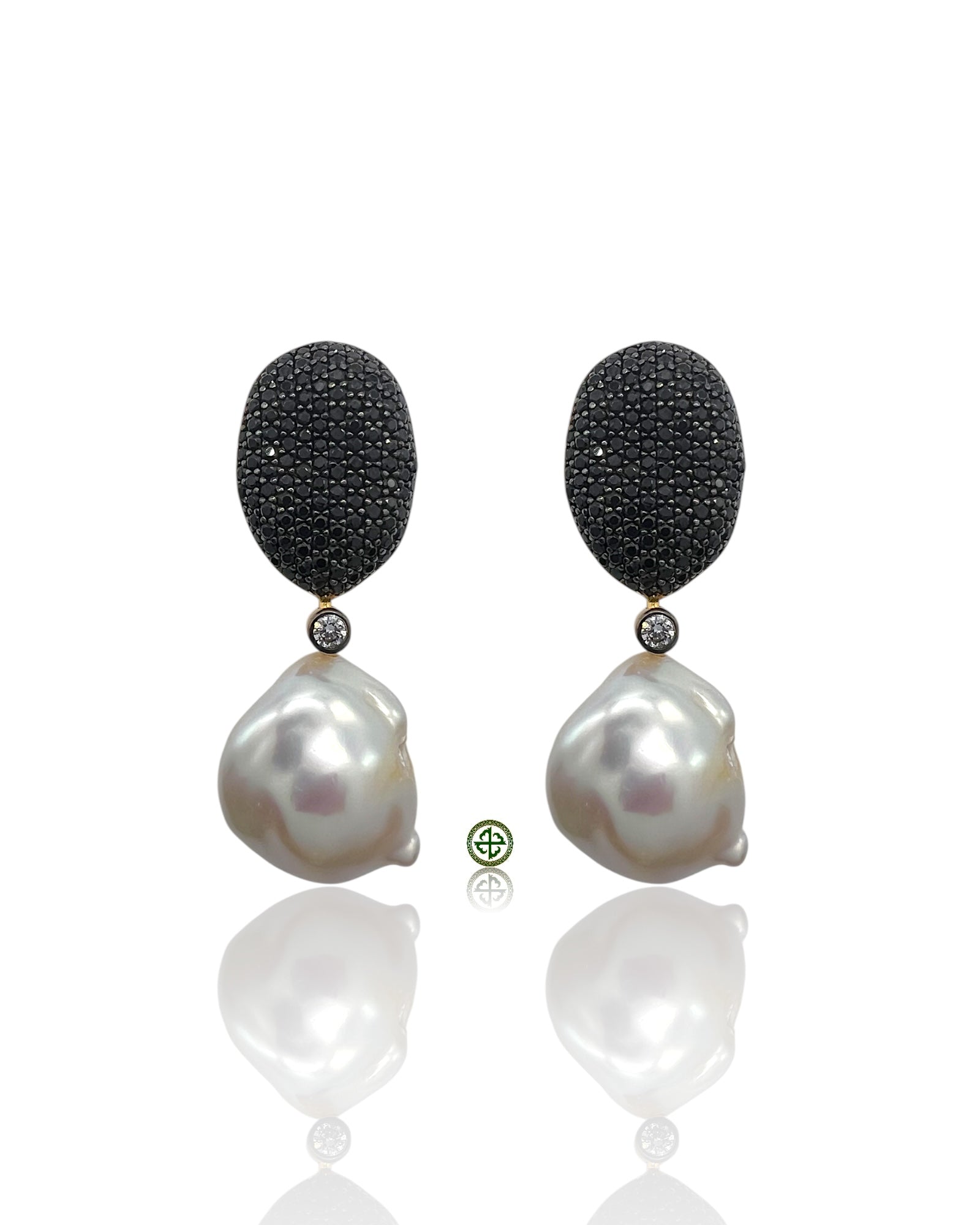 The Black Pavé Baroque Pearl Drop Earrings merge bold sophistication with organic beauty. A shimmering pavé-set black upper design, linked by a brilliant white zircon accent, descends into a luminous baroque pearl, each one unique and radiant. The contrast of dark pavé sparkle and natural pearl lustre creates a refined yet edgy balance, perfect for evening wear or elevated daytime style. Black pavé stones bring mystery and depth, while baroque pearls are often associated with individuality and purity, making these earrings both meaningful and captivating.