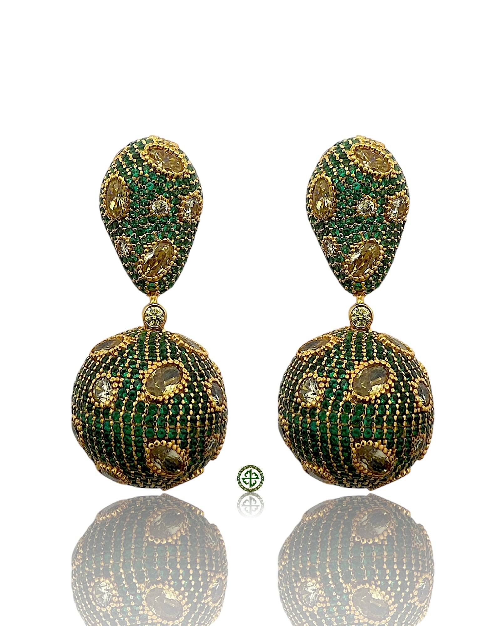 These Emerald Green Pavé Peridot Drop Earrings bring together bold color and refined luxury. Designed in radiant gold vermeil, the spherical drop is encrusted with emerald-green pavé stones and accented by shimmering peridot-toned crystals. The rich green hues and golden finish create a striking contrast, making these earrings a statement piece for evening events, weddings, or elevated daily style.