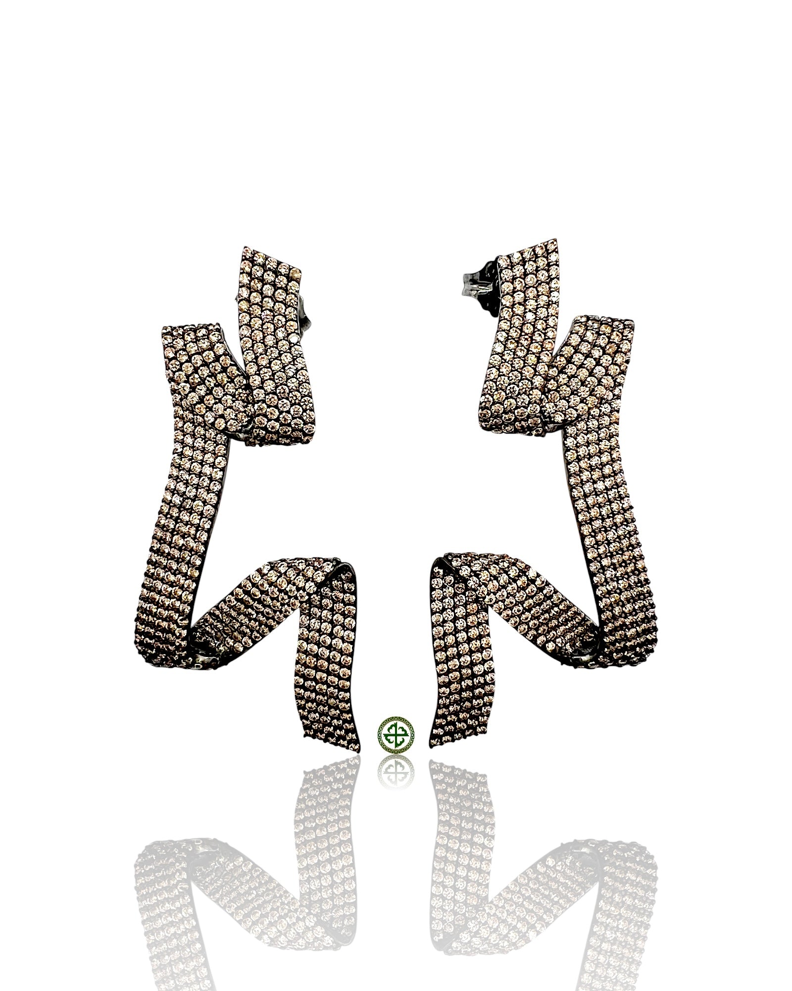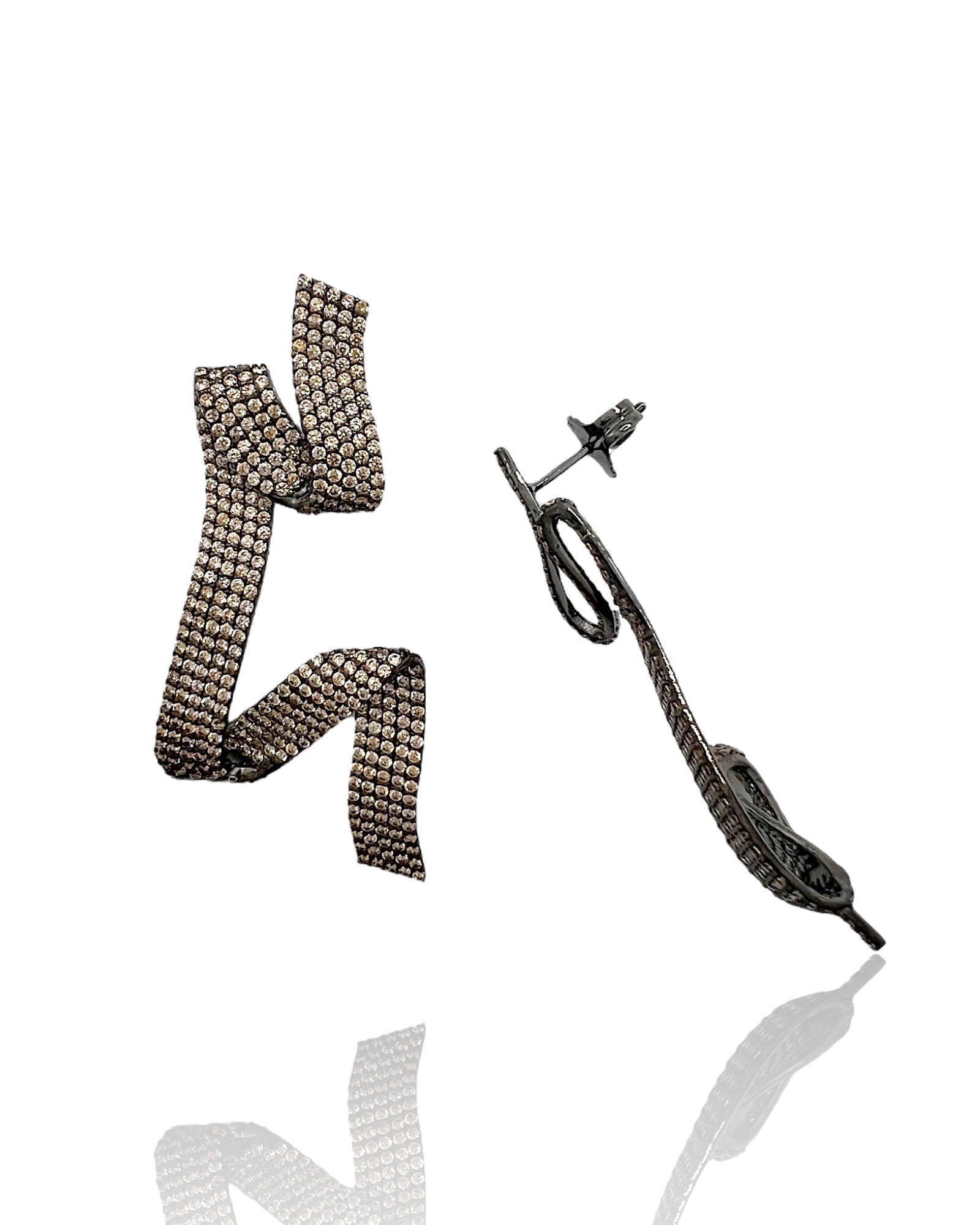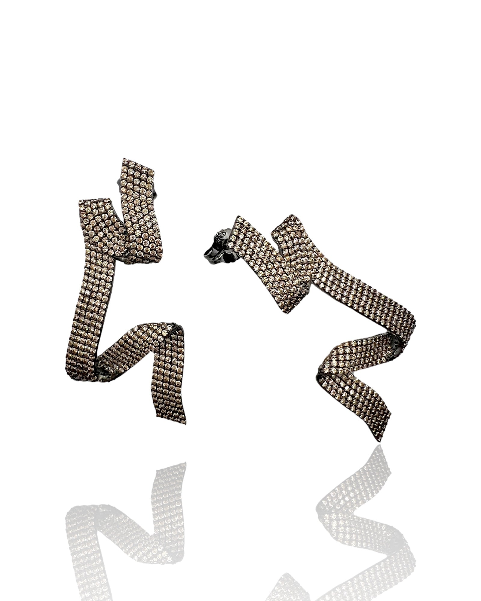 • Ribbon-inspired geometric design with sculptural movement • Champagne pavé stones radiating warm sparkle • Bold contrast of luminous stones and black rhodium finish • Statement earrings crafted for evening glamour and modern luxury