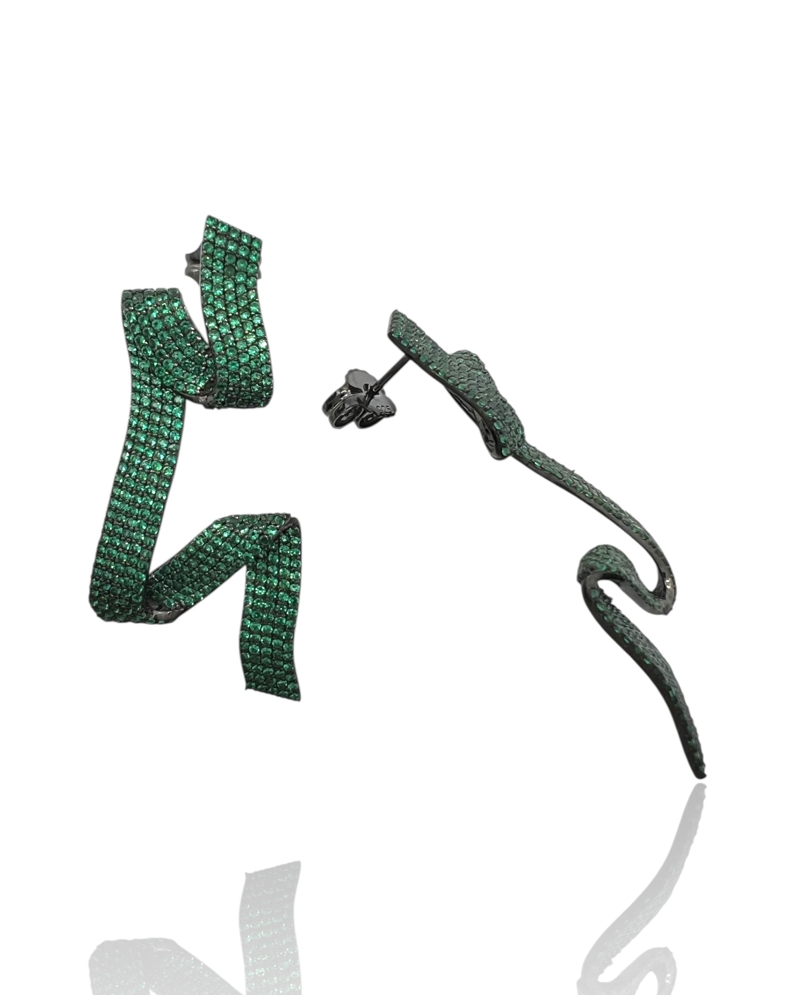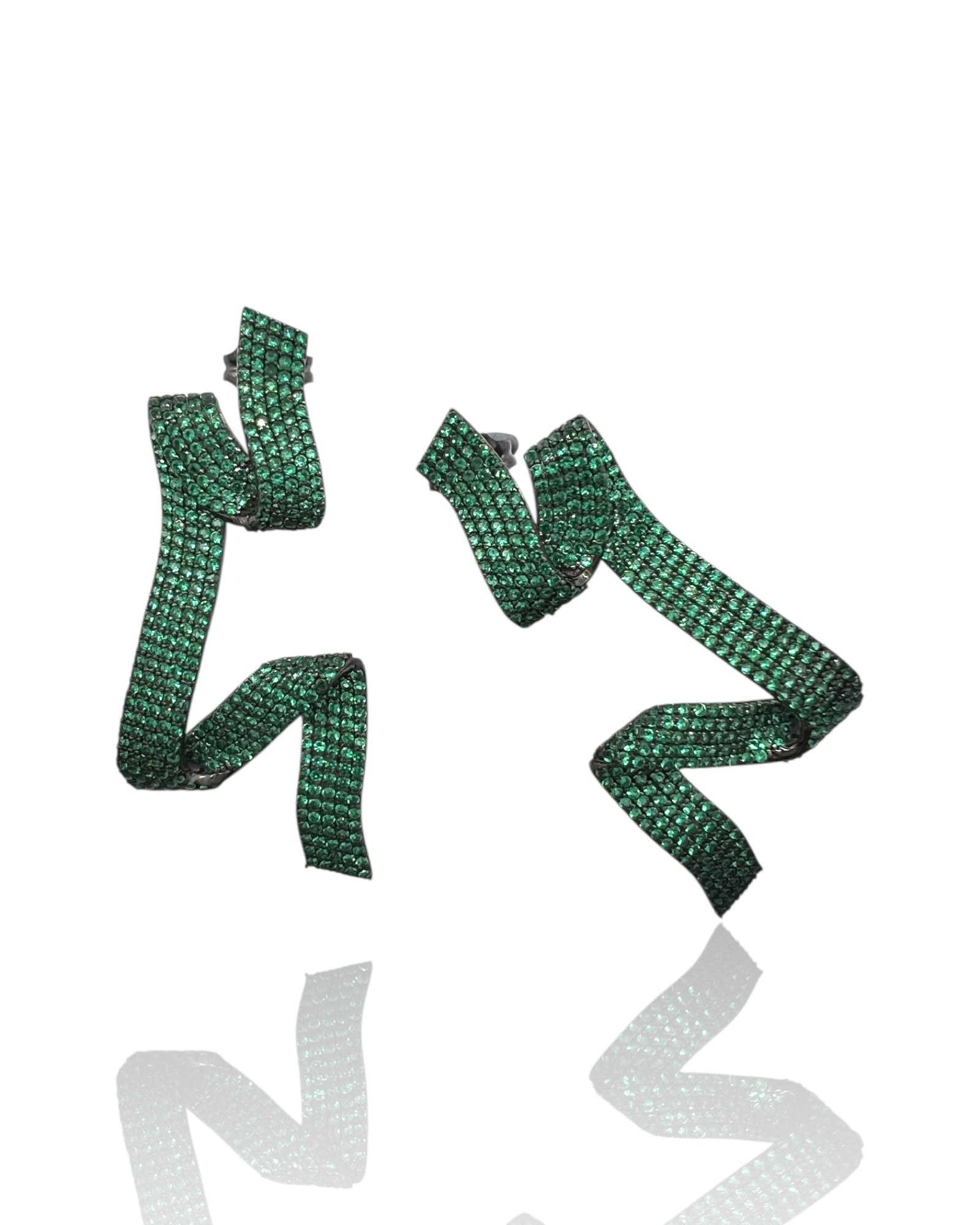The Geometric Emerald Green Pavé Earrings showcase bold modernity and refined artistry. Their ribbon-like silhouette glimmers with emerald pavé stones, radiating vibrancy against the dramatic depth of black rhodium plating. The architectural design adds sculptural elegance, while the vivid green sparkle symbolises harmony and renewal. Perfect for evening wear, cocktail parties, or elevating everyday looks with a statement of luxury.