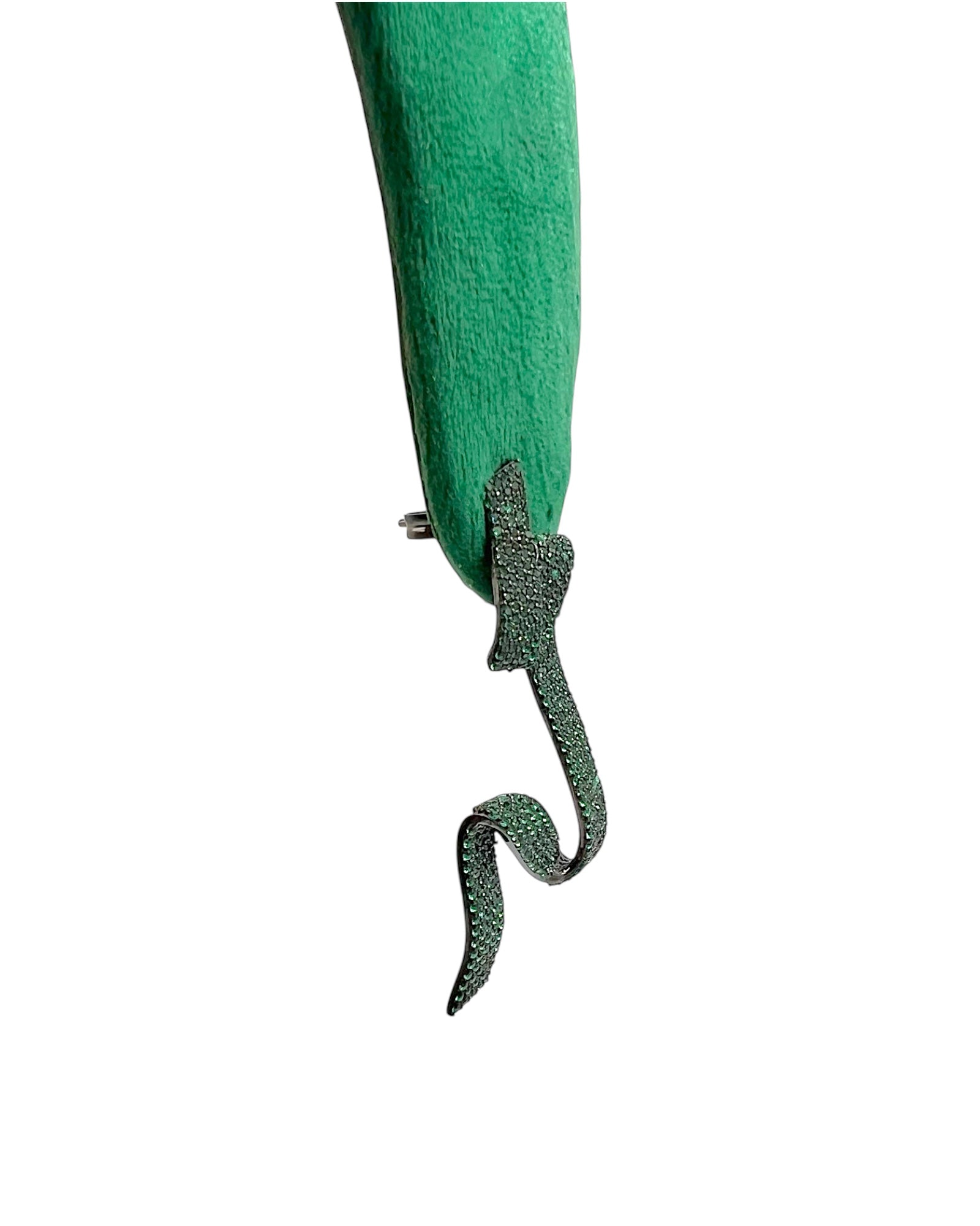 • Ribbon-inspired geometric form with sculptural edge • Emerald pavé stones said to symbolise renewal and harmony • Contrasting black rhodium finish enhances vivid sparkle • Handcrafted earrings designed for bold evening elegance