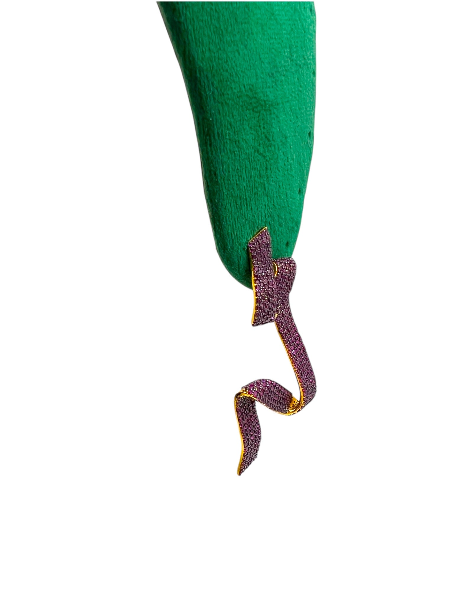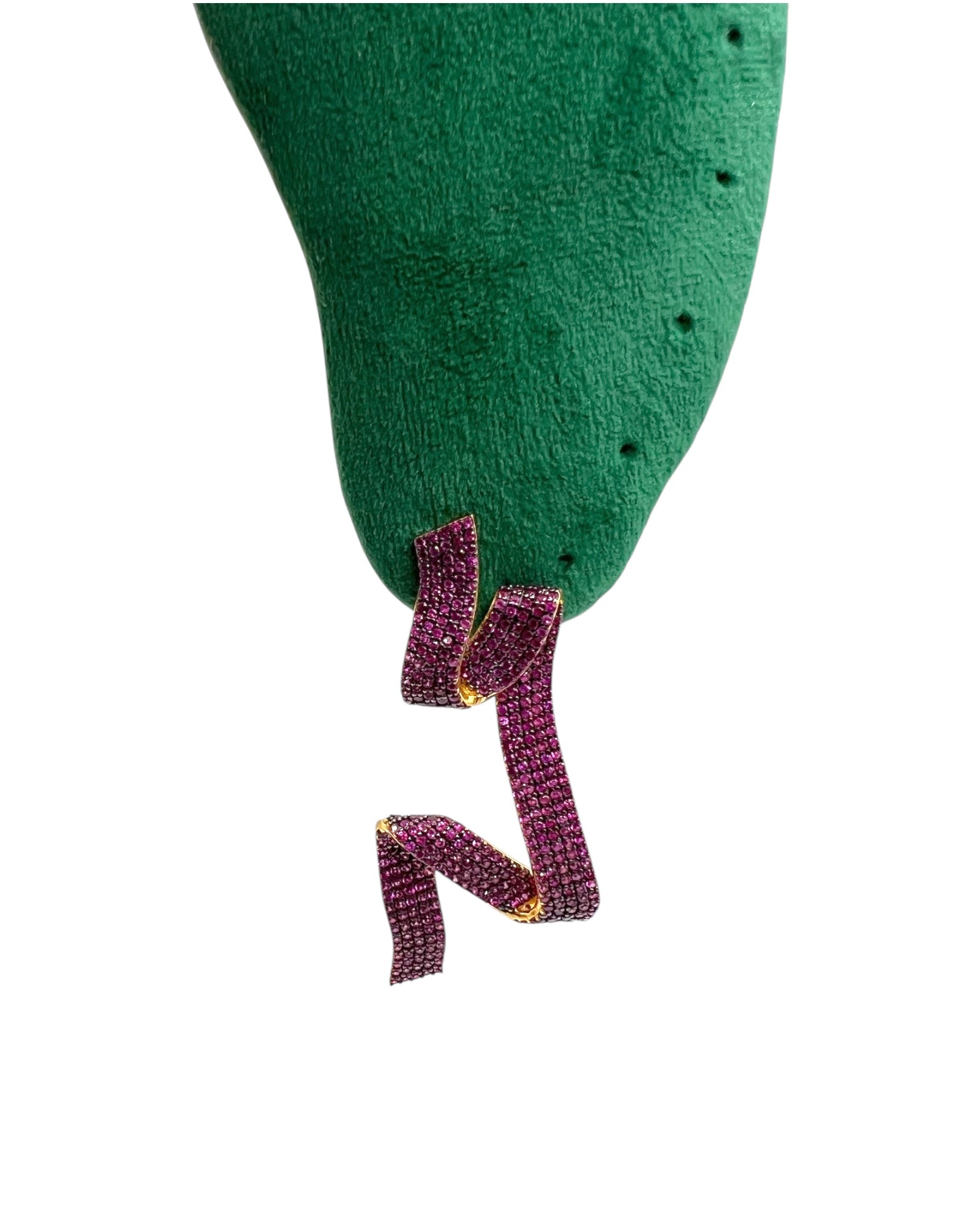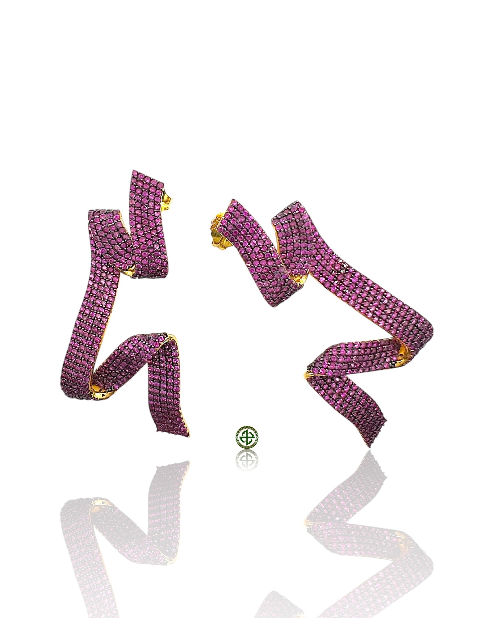 The Geometric Ruby Pink Pavé Earrings bring glamour and modern artistry together in a striking design. Encrusted with vivid ruby pink pavé stones, the ribbon-inspired silhouette glimmers with sculptural elegance, catching light from every angle. Crafted in thick gold vermeil for a luxurious finish, these earrings combine bold colour with architectural sophistication. Perfect for evening wear, weddings, or adding a radiant statement to your daily style.