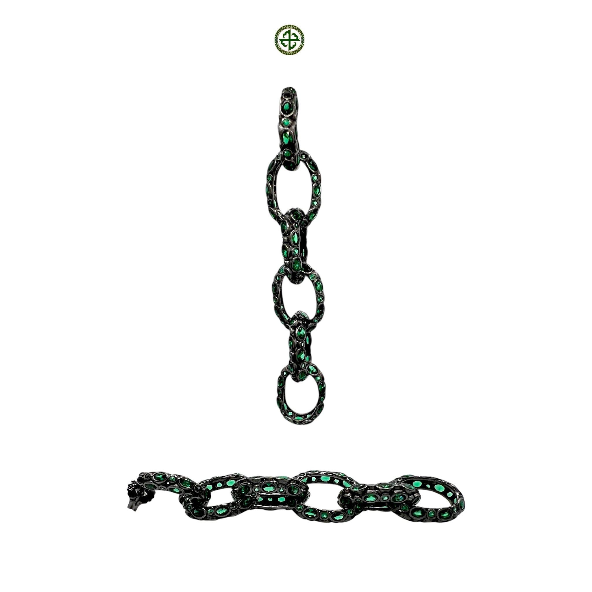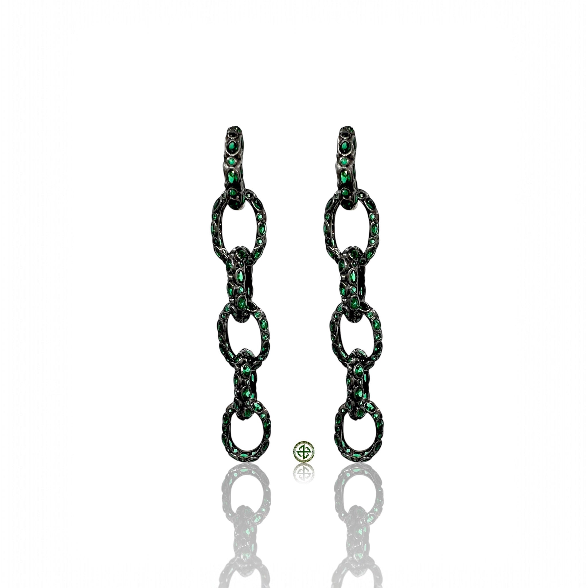 Mystique and elegance intertwine in these Green Zirconia Black Rhodium Chain Earrings. Crafted with AAA-grade diamond green zirconia, each stone cascades in an organic formation, shimmering against the depth of the dark rhodium finish. Their elongated, fluid silhouette evokes movement and drama, making them the perfect statement for evening glamour or elevated contemporary style.
