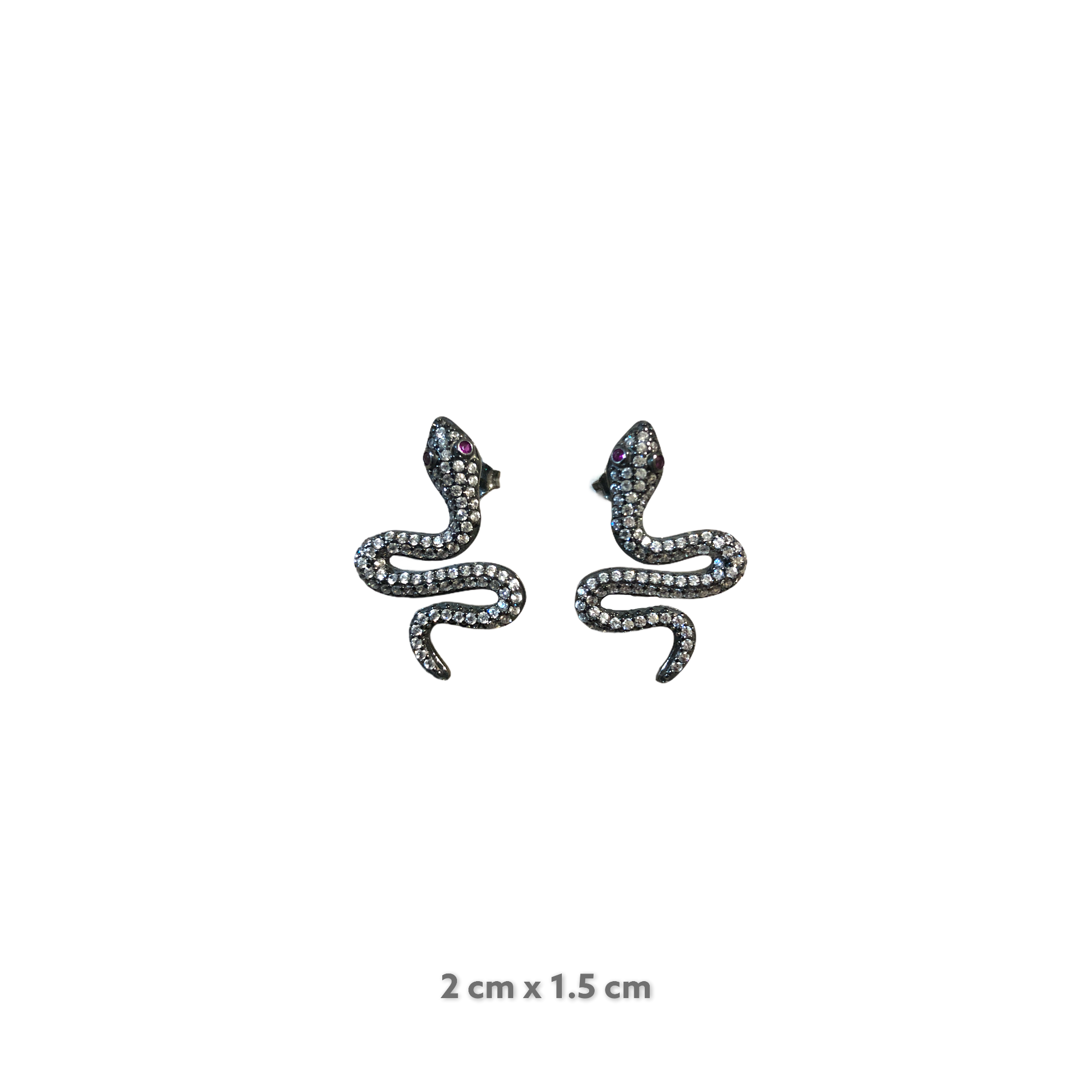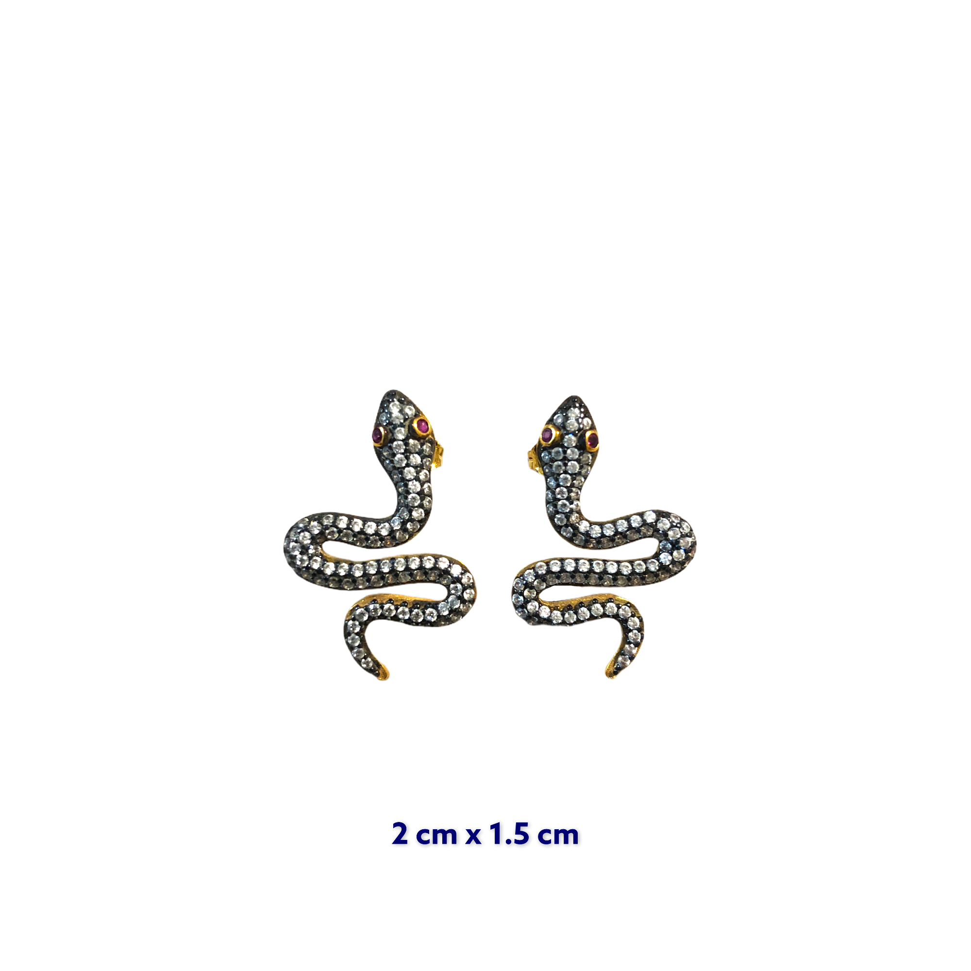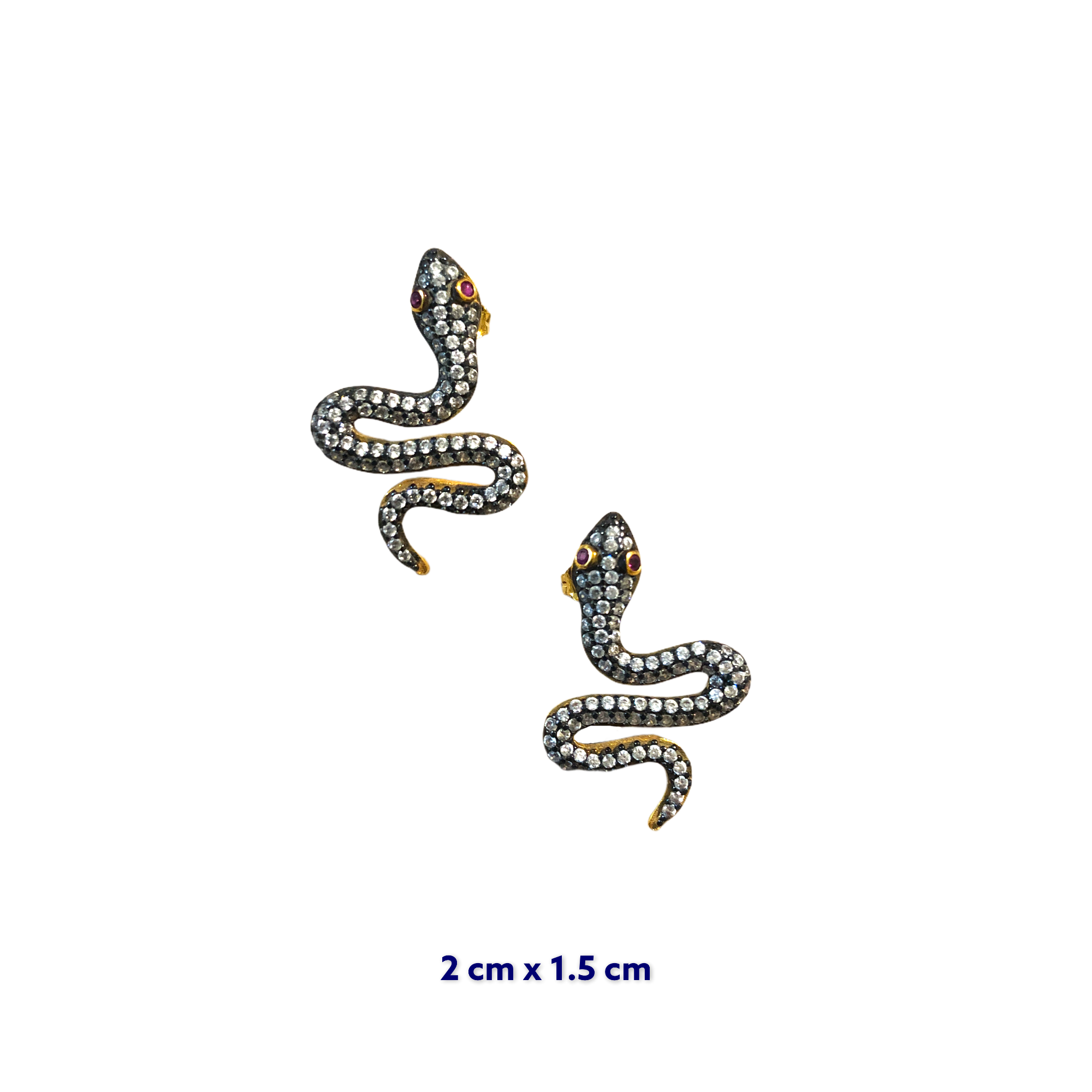 The Mini Snake Earrings embody mystique and contrast, where serpentine curves meet the sparkle of clustered zirconias. Each earring is crafted with black rhodium for depth and edge, offset by luminous 18K gold vermeil that brings warmth and balance. The snake, a timeless symbol of transformation and renewal, is reimagined here in miniature form, dazzling with vibrant stones that catch the light at every turn. Compact yet captivating, they are a striking choice for both everyday intrigue and evening glamour.