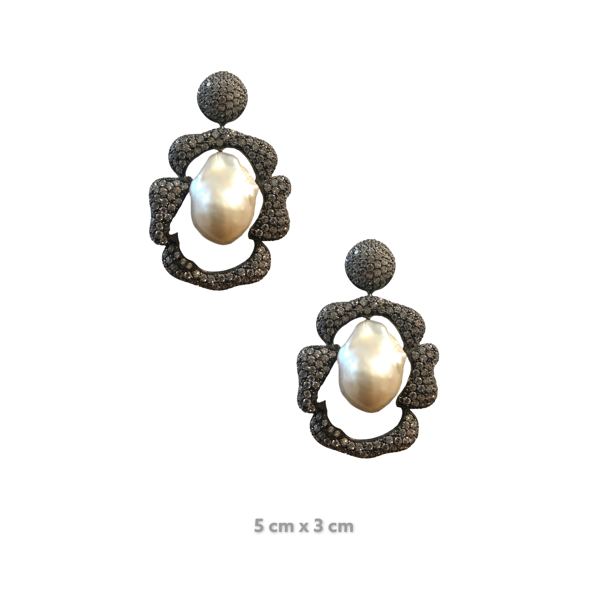 The Noof Baroque Pearl Earrings are a vision of drama and elegance. Their design fans outward in a striking pattern, where deep tones meet radiant brilliance. At the centre, a glowing baroque pearl shines with the elemental fire of the earth, contrasted by shimmering white zirconias. Bold yet refined, these earrings balance organic beauty with architectural power, making them an unforgettable statement for evening glamour or special occasions.